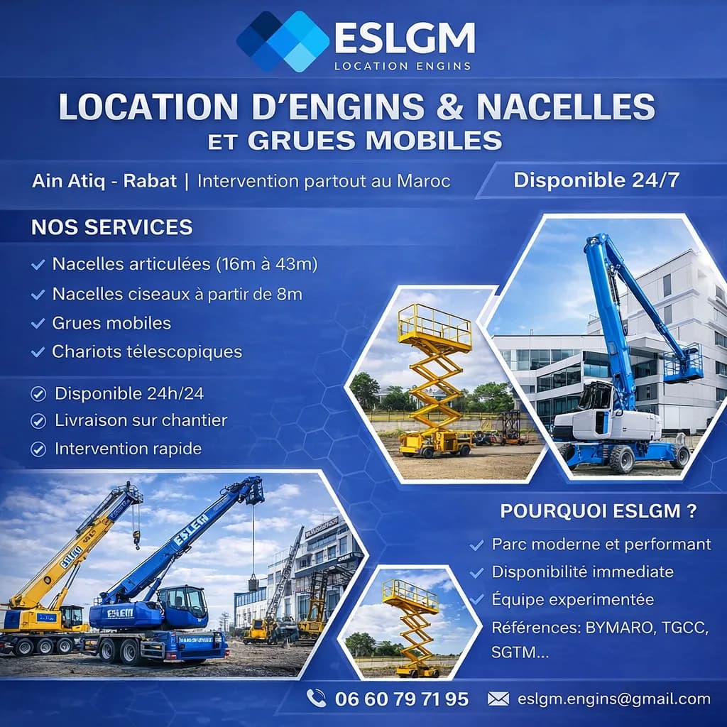 ESLGM (ES Location Geru Mobile) est une entreprise marocaine spécialisée dans la location et l’importation de grues mobiles, nacelles et chariots télescopiques. Basée à Ain Atiq, nous accompagnons les professionnels du BTP et de l’industrie avec des équipements performants et un service fiable.