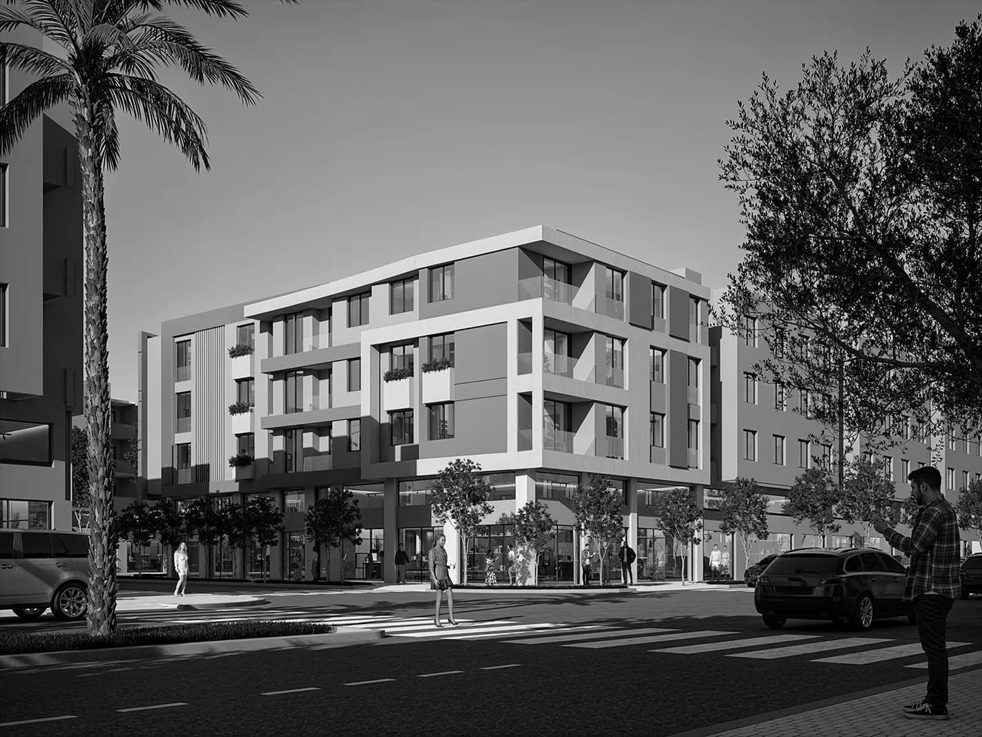 Immeuble résidentiel R+3 situé à Marrakech, alliant architecture contemporaine et touches marocaines. Façade en tons ocres, claustras décoratifs, balcons ombragés. Appartements lumineux avec terrasses. Conception bioclimatique, matériaux durables, cadre de vie confortable et intégré au climat local.