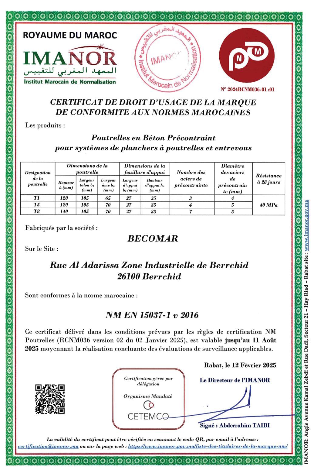 BECOMAR est une entreprise marocaine spécialisée dans la production et la commercialisation de solutions béton innovantes et de qualité supérieure. Fondée pour répondre aux besoins croissants du marché de la construction, elle s'appuie sur une expertise technique pointue et des moyens de production modernes pour offrir à ses clients des produits fiables et durables. L’offre de BECOMAR couvre une large gamme de produits en béton préfabriqué, allant des agglos, poutrelles et hourdis certifiés aux normes marocaines, aux solutions de post-tension, en passant par les éléments précontraints et les produits spéciaux conçus sur mesure pour les projets les plus exigeants. BECOMAR met un point d’honneur à innover en permanence, investissant dans la recherche et le développement pour anticiper les tendances du marché et proposer des solutions performantes. Son laboratoire interne assure un contrôle qualité rigoureux à chaque étape du processus de production, garantissant la conformité et la fiabilité de ses produits. Soutenu par un service client réactif et une équipe d’ingénieurs et de techniciens qualifiés, BECOMAR accompagne ses clients dans la réalisation de leurs projets, de la conception à la livraison. Grâce à son engagement pour la qualité et sa vision tournée vers l’avenir, BECOMAR s’impose comme un partenaire de confiance et un acteur majeur du secteur du béton au Maroc.