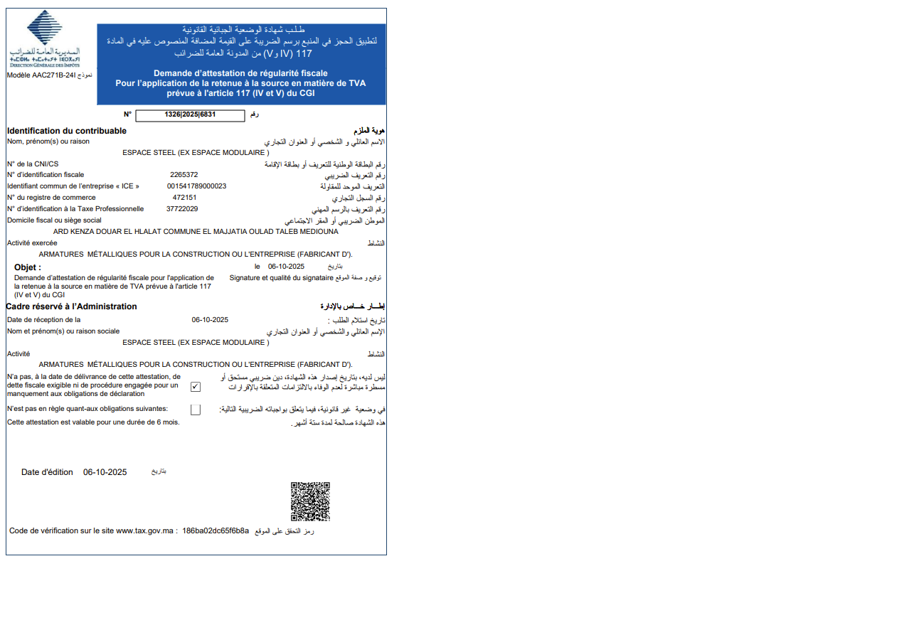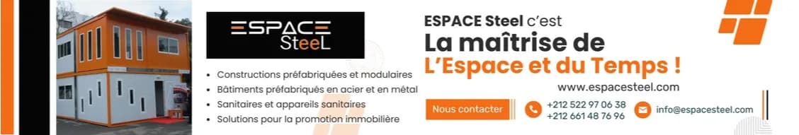 La société Espace Steel est une entreprise marocaine spécialisée dans la conception, la fabrication, la vente et la location de bâtiments modulaires et de structures métalliques. Basée à Médiouna (Casablanca), elle intervient principalement dans le secteur de la construction modulaire et métallique, offrant des solutions adaptées aux besoins des chantiers et projets industriels ou commerciaux. Espace Steel se positionne comme un acteur spécialisé dans la construction modulaire, en proposant des solutions innovantes, rapides et flexibles pour répondre aux besoins de ses clients, que ce soit pour des bureaux de chantier, des abris, des guérites, des blocs sanitaires ou autres structures modulaires préfabriquées. La société met un accent particulier sur : ✔️ La qualité de fabrication et l’utilisation de matériaux robustes, notamment en acier galvanisé. ✔️ La réactivité et la rapidité d’exécution des projets. ✔️ Des solutions modulaires adaptables selon les besoins spécifiques des clients. Espace Steel propose une gamme variée de produits et prestations, notamment : • Constructions modulaires préfabriquées (bureaux, logements temporaires, abris, etc.) • Bâtiments métalliques mobiles • Blocs sanitaires et équipements dédiés • Location et vente d’unités modulaires • Étude, conception et installation clés en main