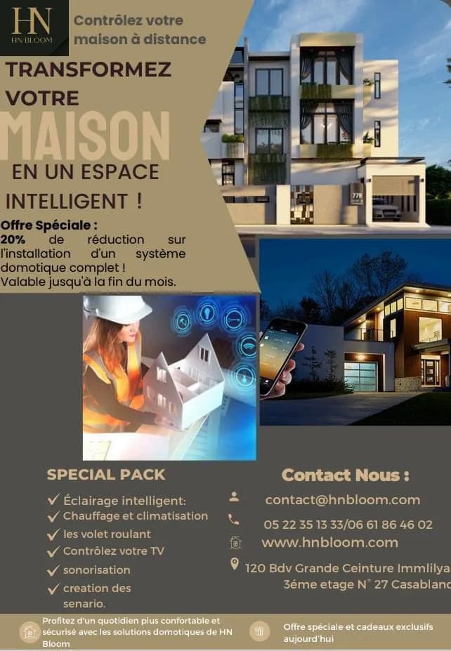 HN BLOOM Distributeur des solutions sécurité électroniques et physiques Représentant exclusif de la marque SMART G4 CONTROL des solutions domotique. Spécialisée dans l etude ,installation et la commercialisation des solutions pour les marchés de domotique :sécurité, luminaire,sonorisation. Disposant d une expérience forte dans le marché marocain. Elle capitalise aujourd’hui sur son savoir-faire et ses compétence pour répondre aux mieux aux demandes croissantes en matière de pilotage énergétique, de gestion du confort ,de gestion de la sécurité ou encore l usage des applications multimédias dans le bâtiment résidentiel pour le petit tertiaire ou l’entreprise.
