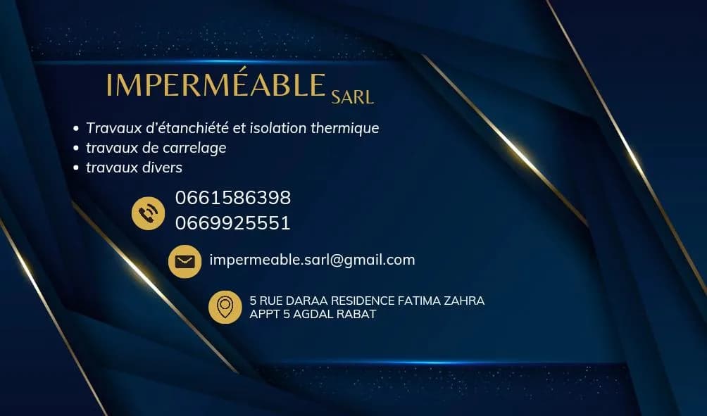 IMPERMEABLE Sarl spécialisée dans l’étanchéité et l’isolation, offrant des solutions durables et performantes pour protéger les bâtiments contre les infiltrations d’eau, l’humidité et les pertes thermiques. Grâce à une expertise technique solide et à plusieurs années d’expérience sur le terrain, nous réalisons des travaux d’étanchéité de toitures, terrasses, façades et fondations, ainsi que des isolations thermiques et acoustiques adaptées aux besoins de chaque client. Nous mettons un point d’honneur à utiliser des matériaux de haute qualité et à respecter les normes de construction en vigueur, garantissant ainsi la fiabilité et la longévité de nos interventions. Notre objectif : assurer confort, sécurité et performance énergétique à vos projets, qu’ils soient résidentiels, commerciaux ou industriels.