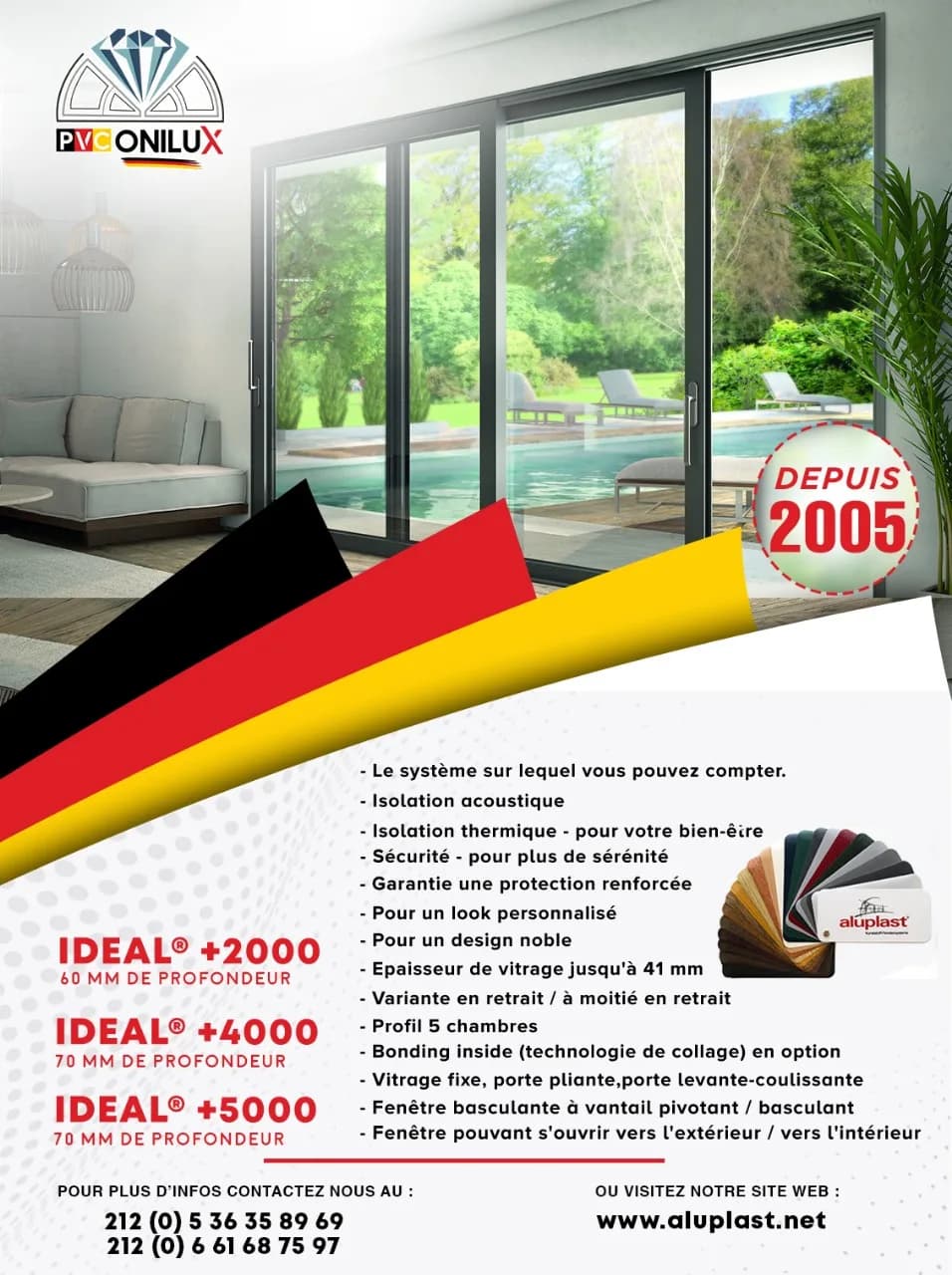 PVCONILUX – L’excellence du PVC allemand, façonnée à Nador PVCONILUX vous propose des solutions haut de gamme en menuiserie PVC, importées directement d’Allemagne auprès du fabricant de renommée mondiale Aluplast. Chaque fenêtre, porte, vitrage, véranda ou pergola est conçue avec des accessoires premium pour garantir une isolation, une sécurité et une durabilité exceptionnelles. Le montage et la configuration sont réalisés à Nador, par des experts qualifiés dotés d’un savoir-faire éprouvé. Grâce à une maîtrise complète de la chaîne – de l’importation à l’installation – PVCONILUX allie la qualité allemande à l’expertise locale, pour vous offrir des réalisations élégantes, robustes et parfaitement adaptées à vos besoins. ✅ Matériaux premium certifiés ✅ Finitions sur mesure ✅ Technologie de vitrage performante ✅ Service client de proximité Optez pour la fiabilité, le confort et l’élégance avec PVCONILUX – la référence en menuiserie PVC Au Maroc .
