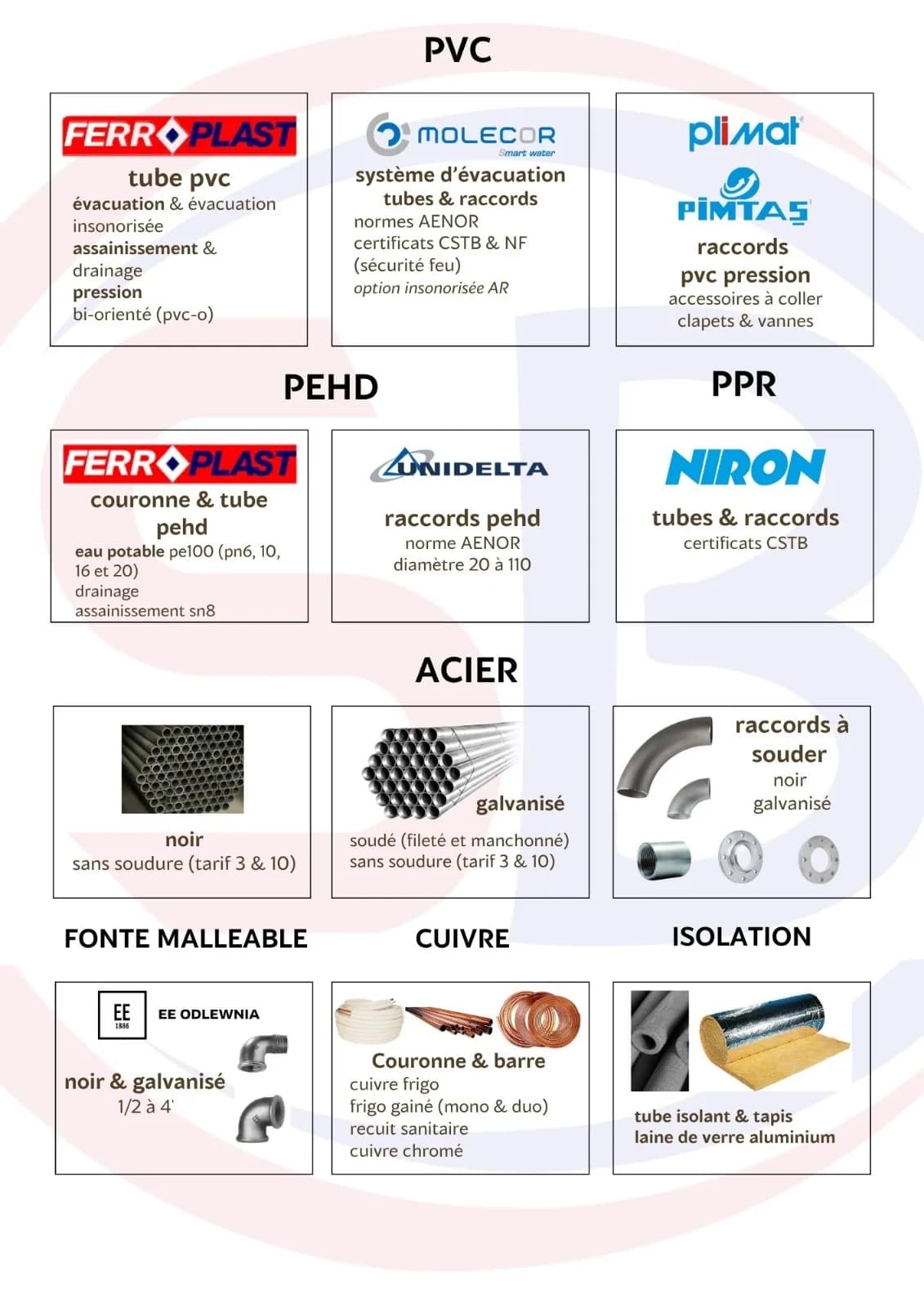 Importation et distribution du matériel de plomberie Tubes et raccords en PVC (évacuation, pression, assainissement) Tubes et raccords en PEHD (PN 6 ; 10 et 16) Tubes et raccords en Acier à souder et en fonte malléable Tubes et raccords en PPR Retube en PEX et PER Raccords en cuivre et laiton Robinetterie de plomberie ( vannes et clapets) Robinetterie Sanitaire