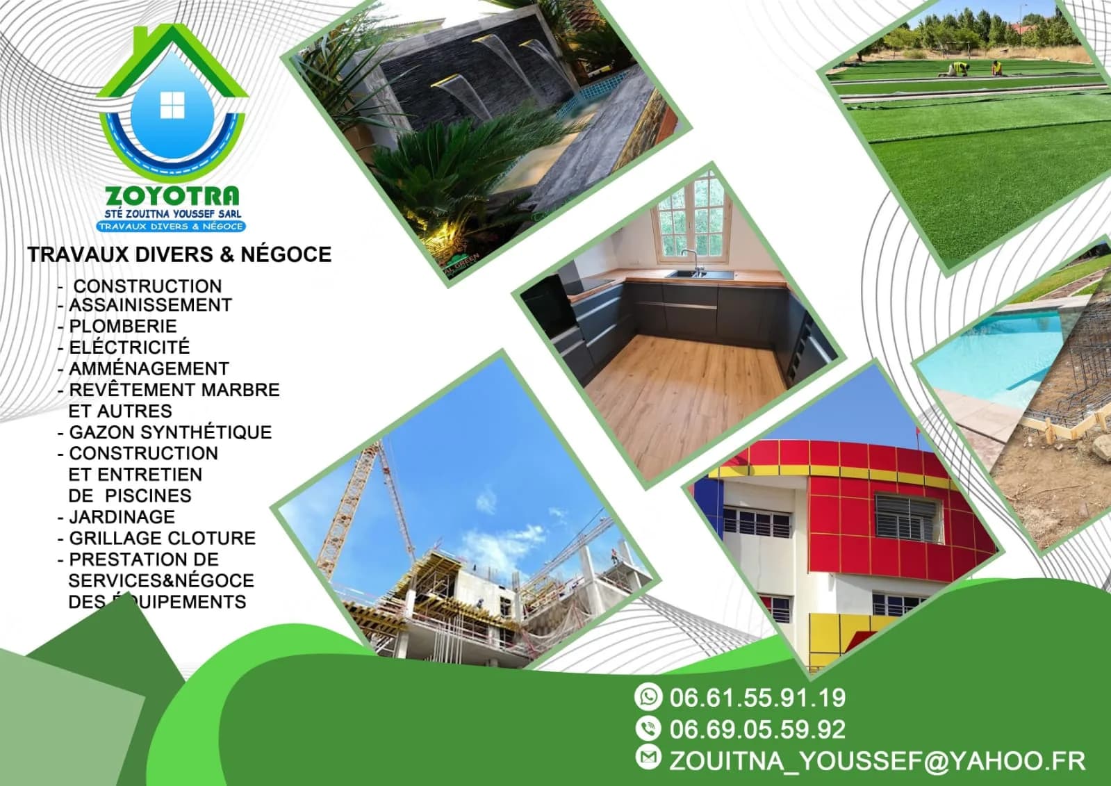 Travaux divers et négoce Mur d'eau et cascade Terrain synthétique Clôture simple et rigide Habillage murale Piscine