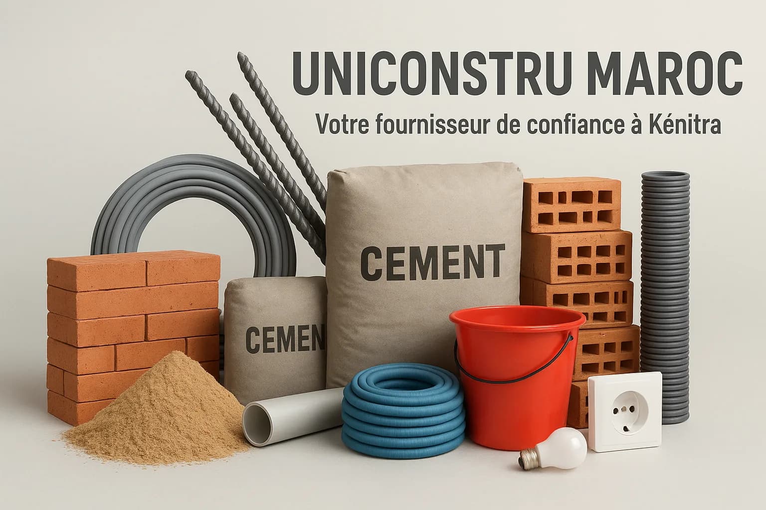 Votre fournisseur de confiance à Kénitra et ses environs : UNICONSTRU MAROC SARL propose une large gamme de matériaux de construction, tels que ciment, fer, sable, gravier, briques, quincaillerie, tuyauterie et équipements électriques. Nous garantissons des produits de qualité, un service fiable et des livraisons rapides pour accompagner vos projets de construction.